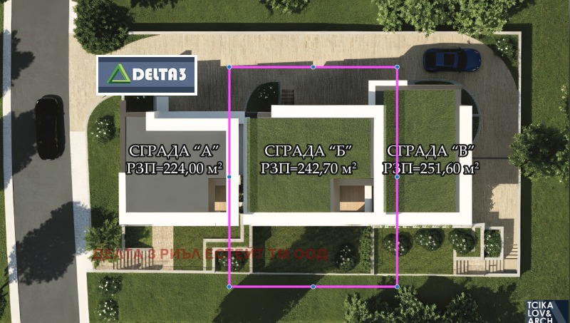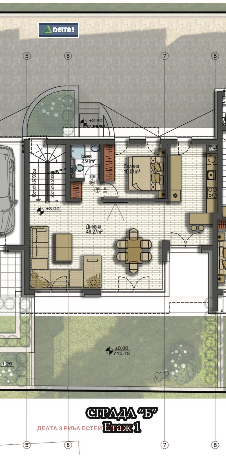 Приземен етаж: веранда, гараж за две коли, техническо помещение и баня с WC.
