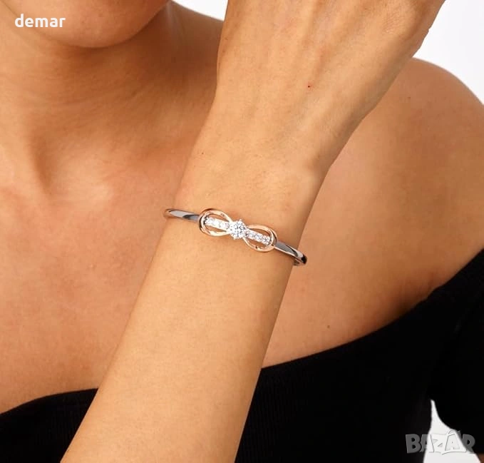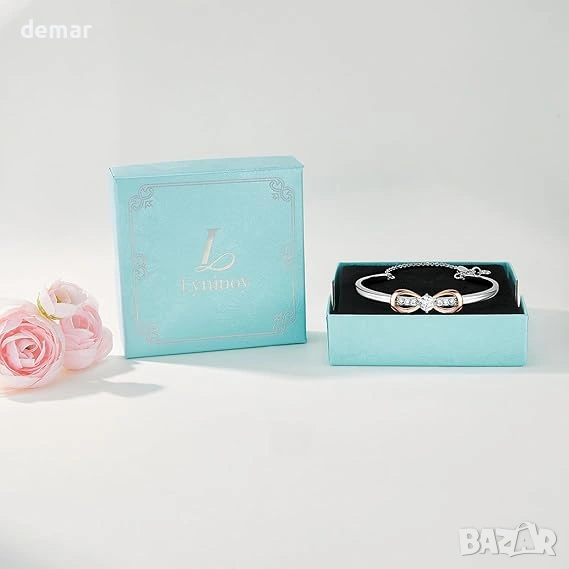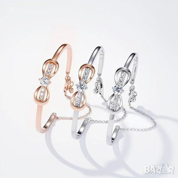 Елегантен дизайн с панделка и безкрайност, символизиращ романтика и вечност, изработен по британските бижутерски стандарти с първокласна месингова основа и 18-каратово бяло и розово златно покритие, с централен кубичен цирконий и допълнителни акцентни камъни за подчертан блясък. Проектирана със сигурна верижка за безопасност тип „омар“, за да се предотврати загуба, като същевременно се запазва изискан, женствен вид, тази гривна балансира майсторска изработка, издръжливост и визуална привлекателност. Тя служи едновременно като значим емоционален сувенир и универсален луксозен аксесоар, представен в екологична подаръчна кутия с кърпичка за почистване и хартия против потъмняване, което я прави подходяща за подаряване по специални поводи като годишнини, рождени дни, сватби, Свети Валентин, Ден на майката и Коледа.