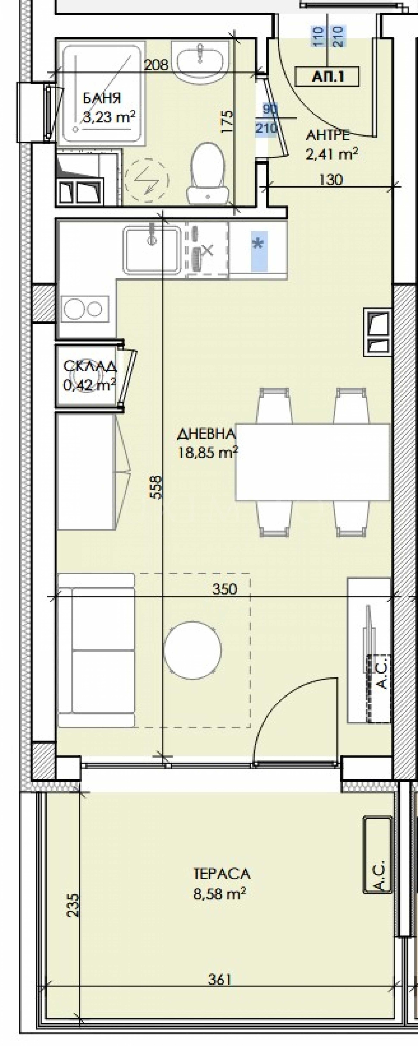 Имотът е с площ от 36,23 кв.м, ситуиран на 1-ви етаж, със собствено дворно пространство с площ от 8,58 кв.м. Подходящ е както за целогодишно живеене, така и за инвестиция.