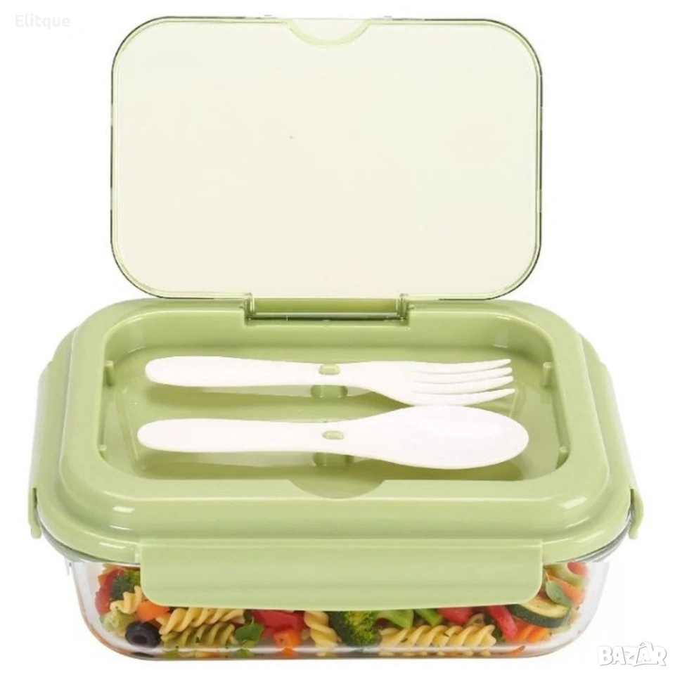 Материал: хранителна пластмаса и стъклен съд; Размери: 20,5 x 15,5 x 8 см; Вместимост: подходяща за пълноценен обяд; Температурна устойчивост: подходяща за съхранение в хладилник; Здравина: стабилни стени и надежден капак; Поддръжка / почистване: лесно ръчно измиване; Допълнителни функции: включени вилица и лъжица; Безопасност за храна: подходяща за директен контакт с храна.