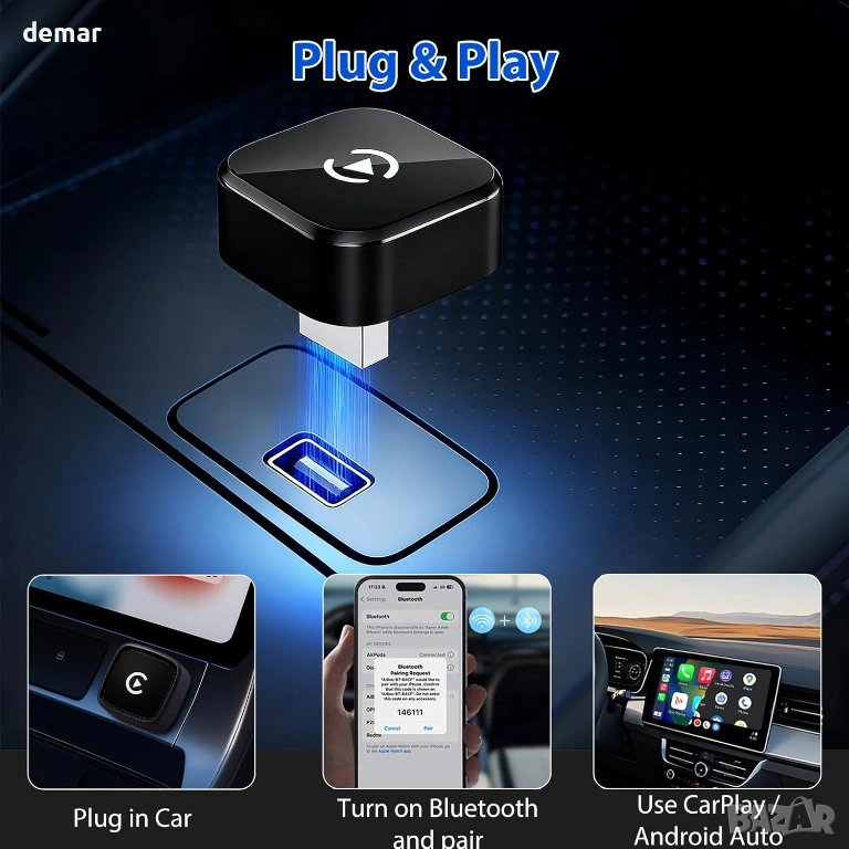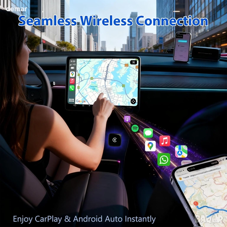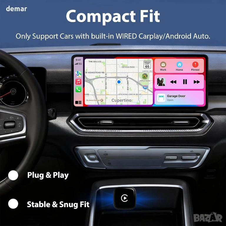 Този plug-and-play адаптер мигновено преобразува фабрично свързаните с кабел CarPlay или Android Auto системи в напълно безжично изживяване, елиминирайки нуждата от кабели, като същевременно запазва пълен достъп до навигация, музика и разговори. Неговият ултракомпактен L-образен дизайн е вграден в USB порта, оставайки почти невидим и дискретен в автомобила. След лесна еднократна настройка, той автоматично се свързва отново всеки път, когато автомобилът стартира, което позволява на приложенията да се зареждат бързо за плавно шофиране със свободни ръце. Устройството поддържа и актуализации по въздуха, за да поддържа производителност и съвместимост във времето. Предназначен е за автомобили, оборудвани с вградени кабелни CarPlay или Android Auto. МОЛЯ, ПРОВЕРЕТЕ СЪВМЕСТИМОСТТА: Няма да работи с автомобили, които нямат тази фабрично свързана функция за свързване, нито е съвместим с BMW, Tesla, Hyundai Elantra, Kia Sorento или Roewe RX8.