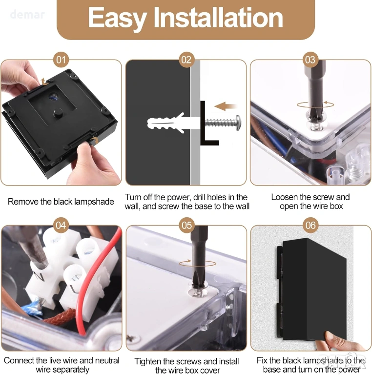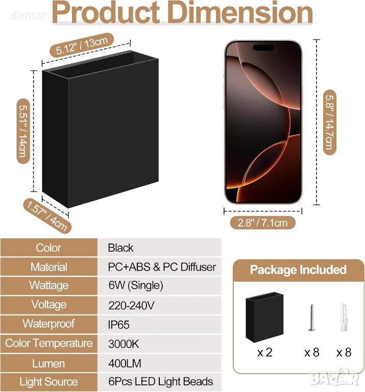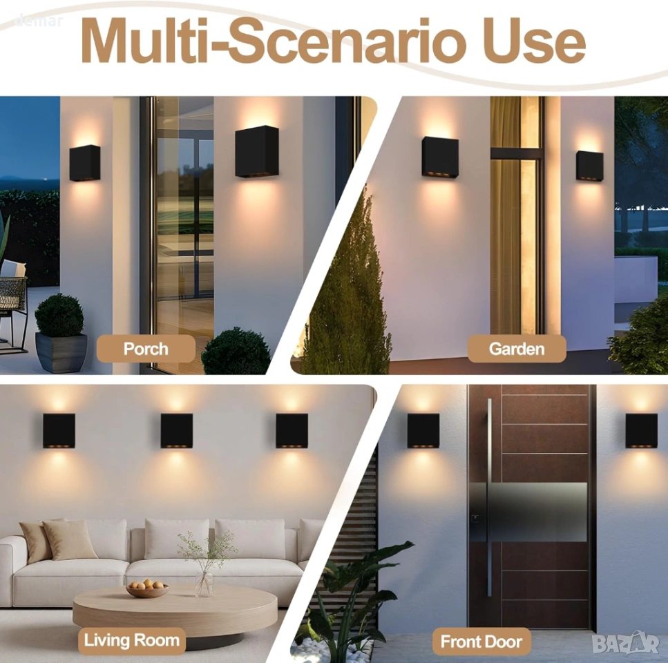 Тези модерни LED стенни лампи се отличават с компактен квадратен дизайн с черно матово покритие, осигурявайки елегантно ветрилообразно топло бяло осветление, насочено нагоре и надолу, което подобрява както вътрешните, така и външните пространства. Те осигуряват меко, комфортно и енергийно ефективно осветление с равномерена, безотблясъчена светлина, докато издръжливата конструкция от PC и ABS с водоустойчива защита IP65 гарантира надеждна работа при всякакви метеорологични условия. Проектирани за стенен монтаж с кабел, те са бързи и лесни за инсталиране с включените аксесоари и са подходящи за широк спектър от декоративни и функционални приложения, като например дневни, спални, стълбища, коридори, веранди, пътеки и дворове.
