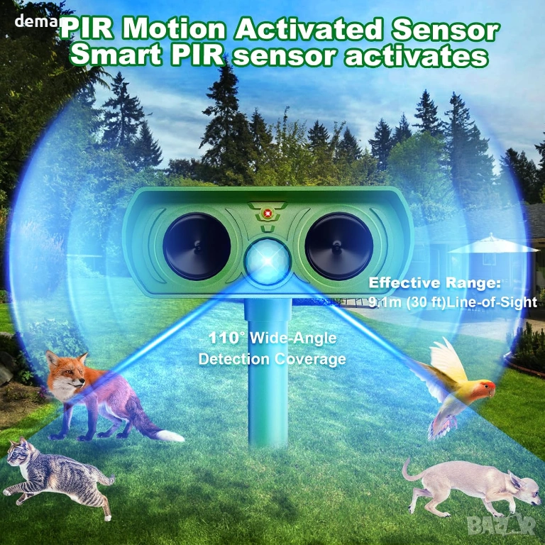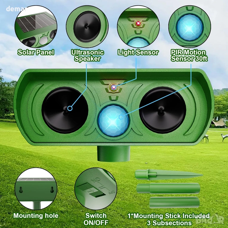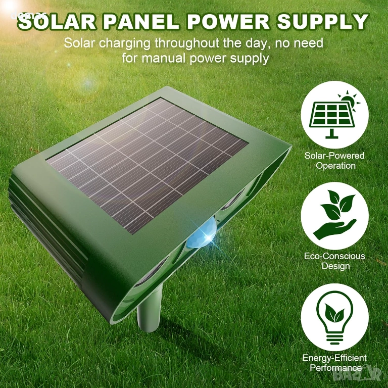 Този ултразвуков репелент за животни използва ултразвук, активиран от движение, за хуманно отблъскване на котки, кучета и други често срещани вредители на открито, като помага за защита на градините и откритите пространства, без да причинява вреда. Той не съдържа химикали и е екологичен, разчитайки на пасивен инфрачервен сензор за откриване на движение и задействане на ултразвукови вълни само когато има животни. Захранван предимно от слънчева енергия с вградена акумулаторна батерия и допълнителна поддръжка за зареждане, той е проектиран за непрекъсната ежедневна употреба. Устройството е лесно за инсталиране с помощта на заземен кол или стенен монтаж и предлага широк ъгъл на откриване с ефективен обхват до 9 метра. Неговата водоустойчива конструкция осигурява надеждна работа целогодишно при дъжд, сняг, вятър и други външни условия.