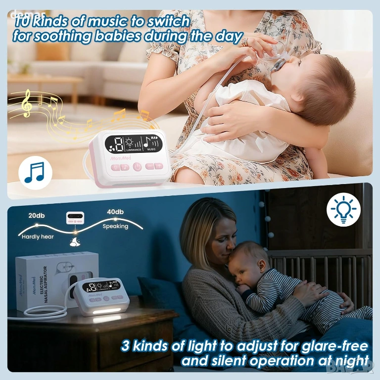 Този електрически бебешки назален аспиратор е с регулируемо засмукване с множество нива на сила, за да отстрани нежно и ефективно запушването, в зависимост от нуждите на вашето бебе, докато меките силиконови накрайници без BPA осигуряват безопасна и удобна употреба от новородени до малки деца. Проектиран да намали стреса по време на употреба, той включва успокояваща нощна светлина и нежни мелодии, които помагат на бебетата да останат спокойни, особено по време на нощни грижи. Хигиената е лесна благодарение на подвижната, прозрачна камера и миещите се части, които позволяват цялостно почистване след всяка употреба. С USB-C презареждащ се и компактен дизайн, той е удобен за ежедневна употреба у дома или в движение, предоставяйки на родителите надеждно облекчение за бебето им по всяко време и навсякъде.