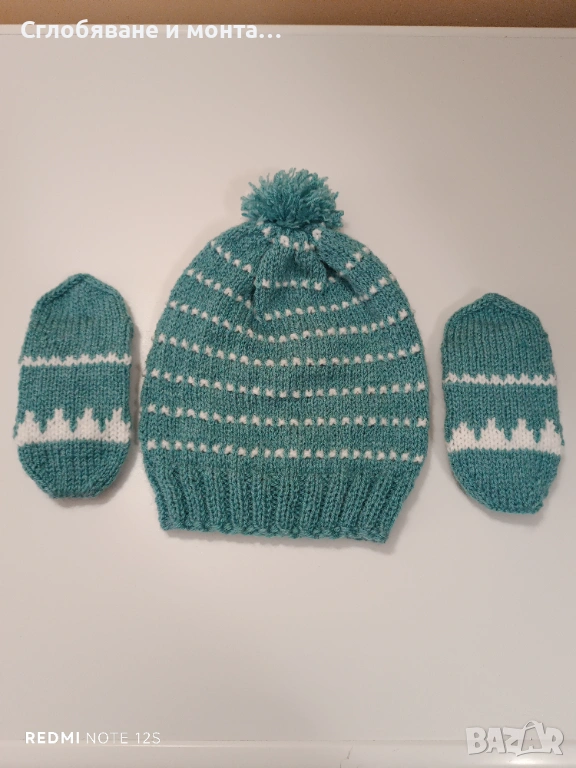 Продавам ръчно плетен детски комплект, включващ шапка и чорапи.