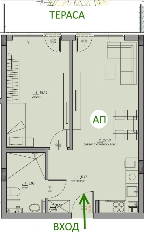 Апартаментът е разположен на първи жилищен етаж и се състои от коридор, баня с WC, тераса, трапезария с кухненски бокс и отделна спалня. Настилките са теракот и паркет, стените са боядисани с латекс. Обща площ-62,60 кв.м.(чиста площ 56.06 кв.м.)