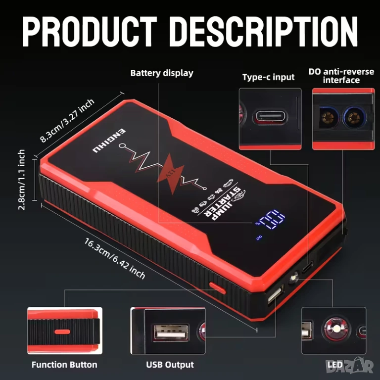 С дисплей, LED фенерче и функция ”POWER BANK” и акумулаторна литиево-полимерна батерия.