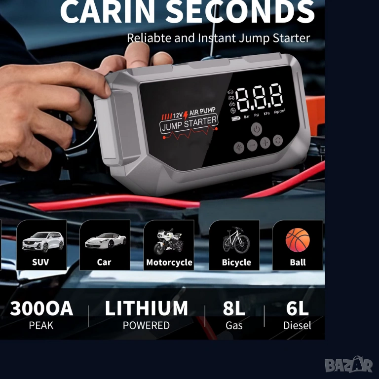 3000 A максимален пиков стартов ток, за двигатели до 8.0 L бензинови и до 6.5 L дзелови