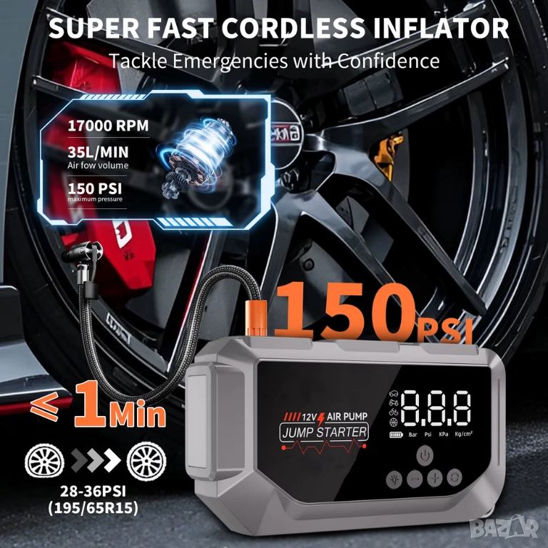 Комбиниран Jump Starter (бичѐ), 12000 mAh, Power Bank, 150 PSI компресор и LED фенер
