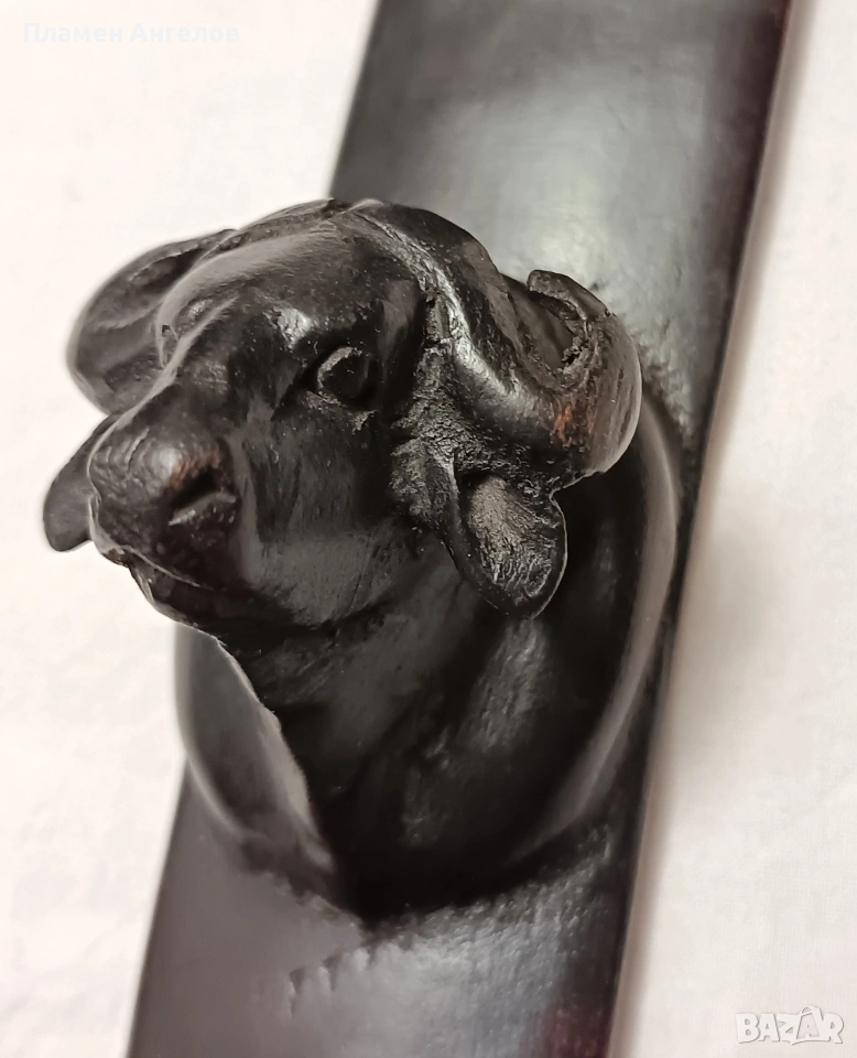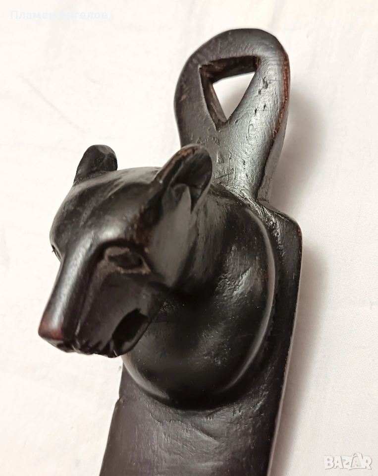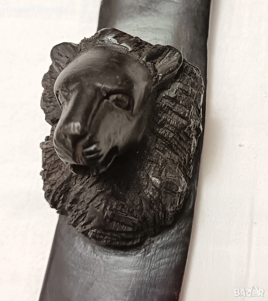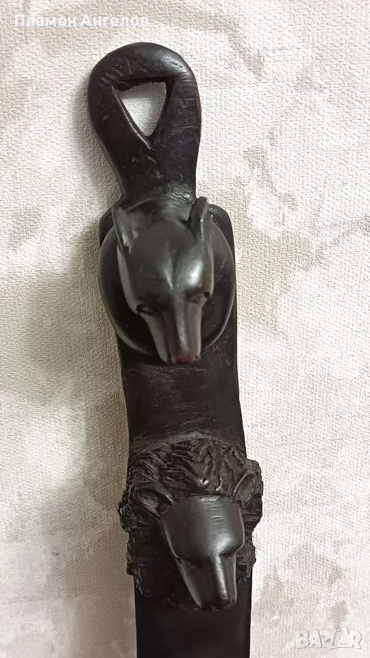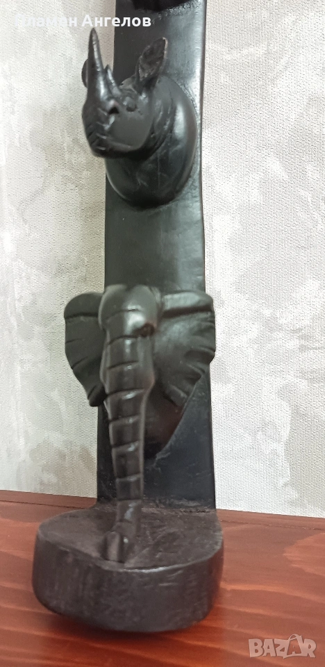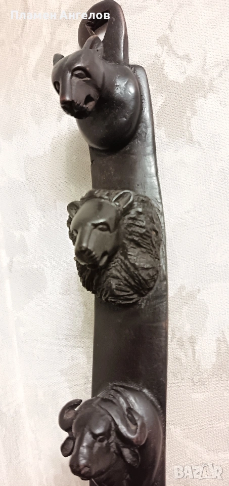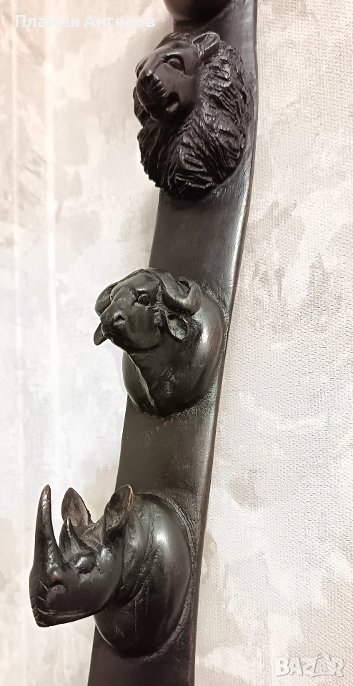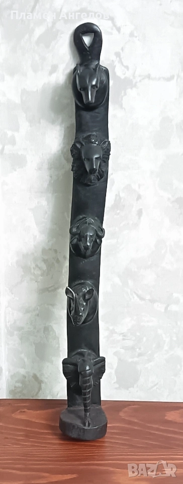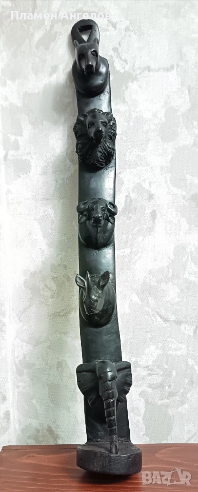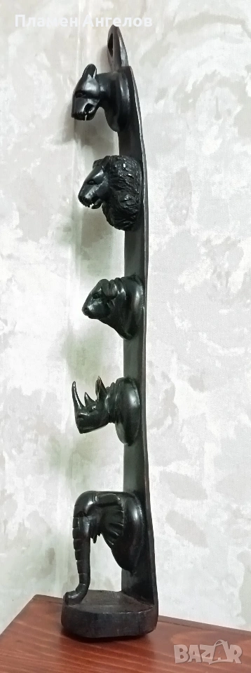 дърворезба, скулптора, сувенир, пано, тотем. Колекционерски предмет, декоративна пръчка, декоративна колона за стени. Изработена от цяло масивно, тъмно, твърдо дърво най-вероятно абанос или друг вид африканско дърво. Изкуство от Африка изобразяваща поредица от животински глави подредени вертикално. Така популярната "Голямата петорка" които носят свойте символика. Слон, лъв, бивол, носорог, леопард. Произведения на изкуството, сувенири произхождащи от Кения и Зимбабве. Изработени са от месни занаятчии от племето Акамба в Кения. Неповторими, ръчно изработени, 100%автентични. Личи си ръчната изработка, само с премитивен (един) инструмент. Повтарям че е автентично. Дължина около 60см.