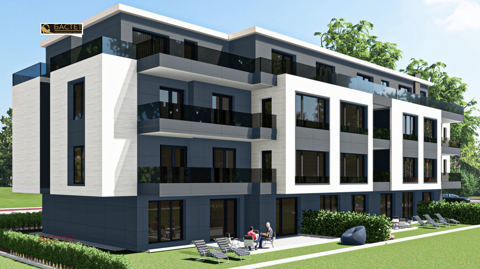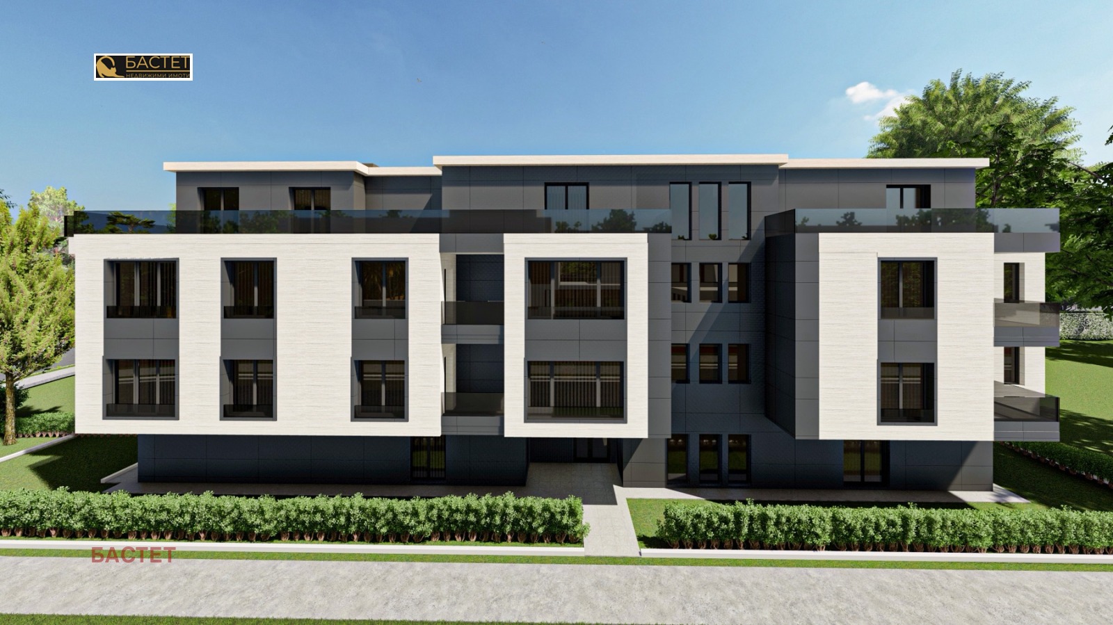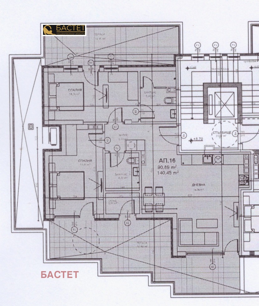 БУТИКОВА СГРАДА СЪС 17 АПАРТАМЕНТА. КРАСИВА ПАНОРАМНА ГЛЕДКА. Просторен и светъл тристаен апартамент със ЗП 140.45 кв.м., разпределени, както следва: покрита част 90.89 кв.м и две панорамни тераси с обща площ 50 кв.м. Състои се от входно антре, дневна с трапезария и кухненски бокс с прилежаща тераса на запад, две спални с втора тераса, баня с тоалетна и втора баня с тоалетна към едната спалня, склад. Изложение: и/з. Сградата ще бъде газифицирана, но има и изводи за климатици.