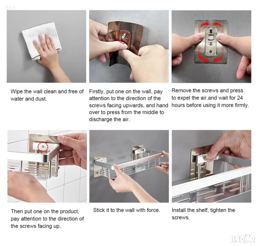Лесен монтаж: подходящ за гладки повърхности. Почистете с бърса вода, маслени петна, прах и др. върху залепващата повърхност. Няма нужда от пробиване, винтовертиране или пробиване на дупки. Просто отстранете прозрачното защитно фолио и го притиснете към стената, лесно и удобно. За да се постигне по-добра производителност, се препоръчва да окачите тежки предмети след 24 часа след залепването.