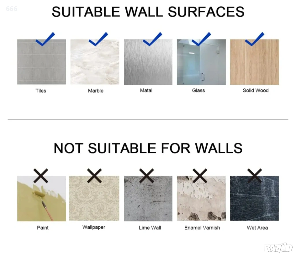 Практичност: Може да се използва за боядисани повърхности, мраморни повърхности, прозрачно стъкло, дървесни шарки, матирано стъкло, твърди пластмасови повърхности и т.н. Може да се постави здраво в стената, тухли, стъкло, метал, дървени врати, дъски. Не може да се използва за тапети или стени, върху които е паднал прах. Без повреди по стената, без нужда от пробиване, здрава носеща способност.