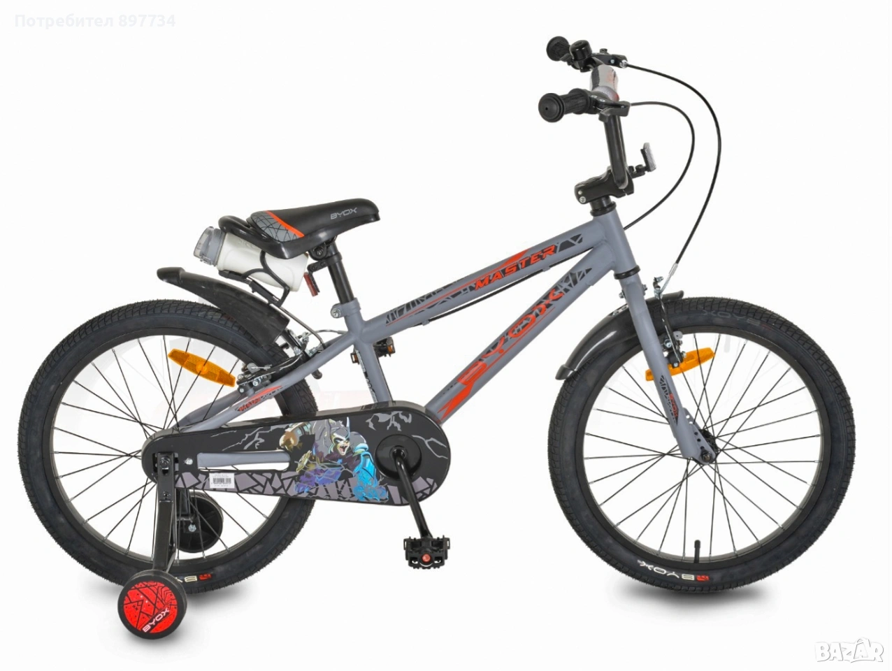 велосипед. Размер на каплите 20 Колелото е чисто ново неизползвано в кашон. Детски велосипед Master 20", Byox е проектиран с мисъл за безопасност, комфорт и стабилност при каране. Със здрава рамка, полезни аксесоари и eргономичност, моделът е подходящ за деца на възраст от 6 до 10 години и ръст от 115 до 135 см и максимално тегло до 45 кг. Основни характеристики: • Стоманена рамка със снижена височина – улеснява обкрачването и качването • Минимална височина на седалката: 54 см от земята • Мека, ергономична седалка – за комфорт по време на каране • Алуминиев държач за кормилото – осигурява стабилност и контрол • Спирачна система: предна и задна V-brake спирачки • Ръчно наплетени алуминиеви капли – здрави и леки • Помощни колела – за допълнителна стабилност при първите карания • Пластмасови калници – предпазват от пръски и замърсяване • Предпазител за веригата – осигурява безопасност по време на движение • Аксесоари: звънец, шише за вода Съчетание от надеждна конструкция и функционални елементи, велосипедът Master 20", Byox е отличен избор за активни деца, които искат комфорт и увереност при всяко каране. Производителят си запазва правото да променя компонентите, като те могат да бъдат заменени с аналогични по качество. Възможни са несъответствия между показаните на изображението компоненти и описаните в текста. В съответствие с изискванията на европейския стандарт EN ISO 8098:2023.