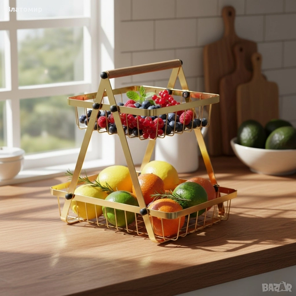 Двуетажна метална поставка за плодове Cheffinger – златист дизайн, компактна и стабилна → Обява 53180648