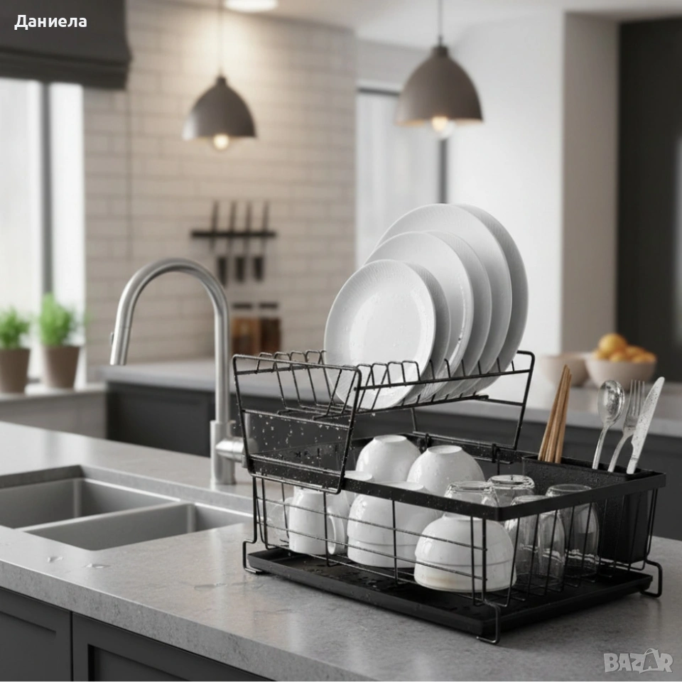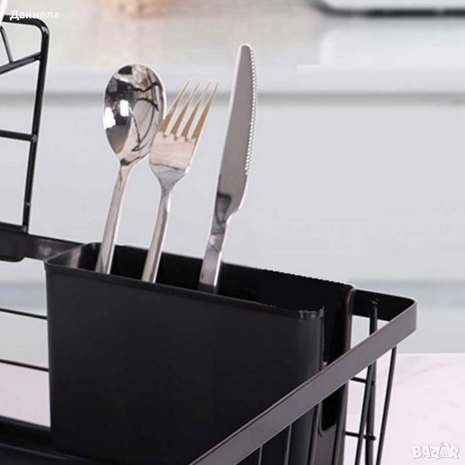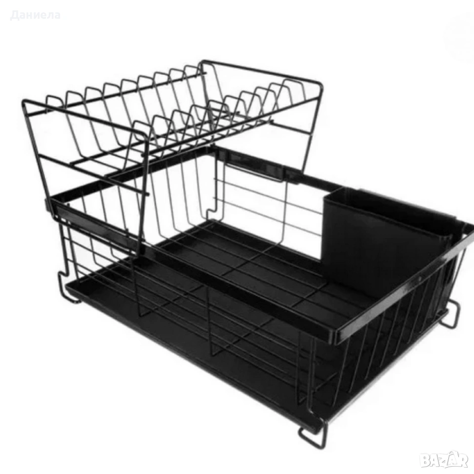 Материал: Метална конструкция; Размери / вместимост: 42,5 × 28 × 27 см / двуетажно разпределение; Дебелина / здравина: Стабилна и устойчива рамка; Поддръжка / почистване: Лесно почистване с влажна кърпа; Допълнителни функции: Отделение за прибори, S-форма за по-добра организация.