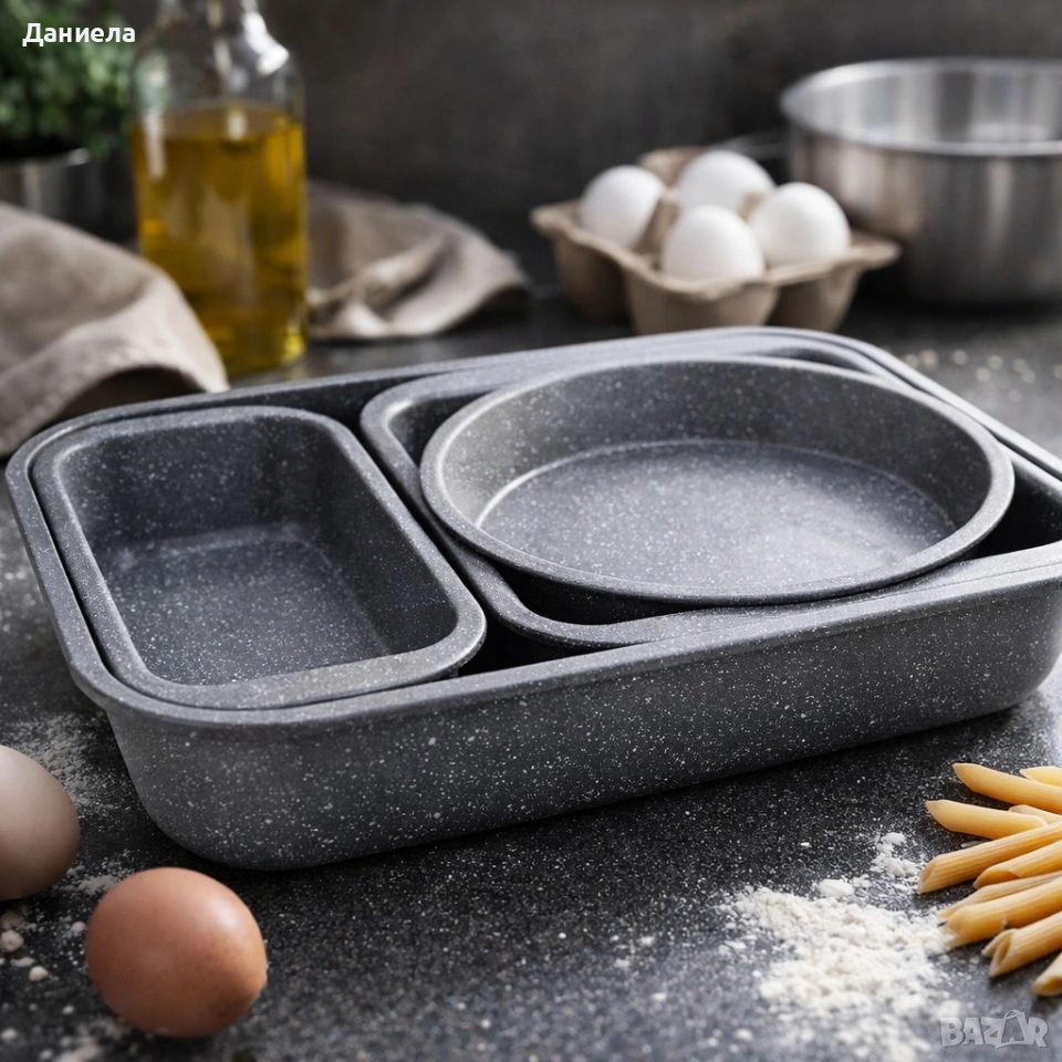 Материал: метал с незалепващо мраморно покритие; Комплект: 4 броя тави за фурна; Форми и размери: Правоъгълна (малка): 29,2 x 14,6 x 6,3 см; Правоъгълна (голяма): 43,5 x 31,7 x 6,5 см; Квадратна: 29 x 26,5 x 6,3 см; Кръгла: 23 x 3,5 см; Температурна устойчивост: подходящи за печене във фурна; Здравина: стабилни стени, устойчиви при висока температура; Поддръжка / почистване: лесно измиване, подходящи за съдомиялна; Допълнителни функции: подреждащи се за компактно съхранение; Безопасност за храна: подходящи за директен контакт с храна.
