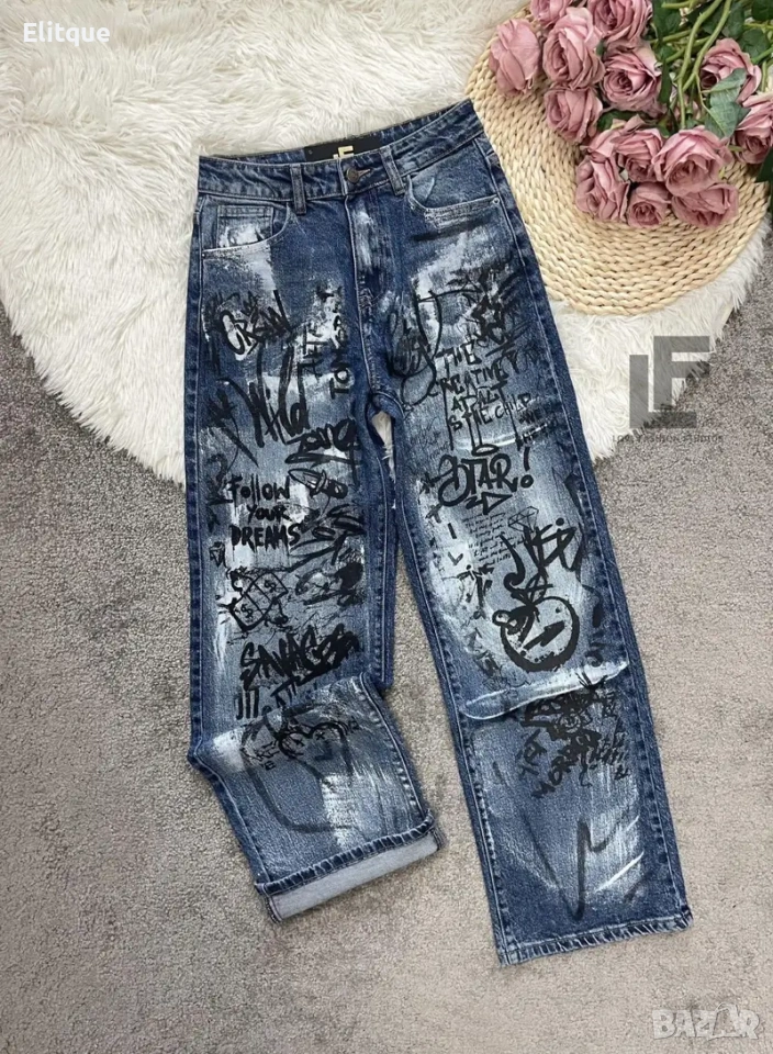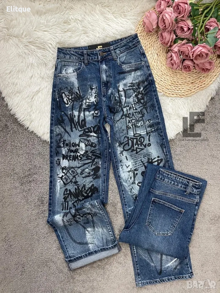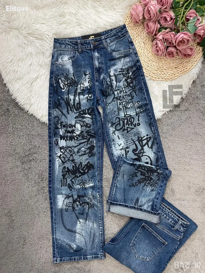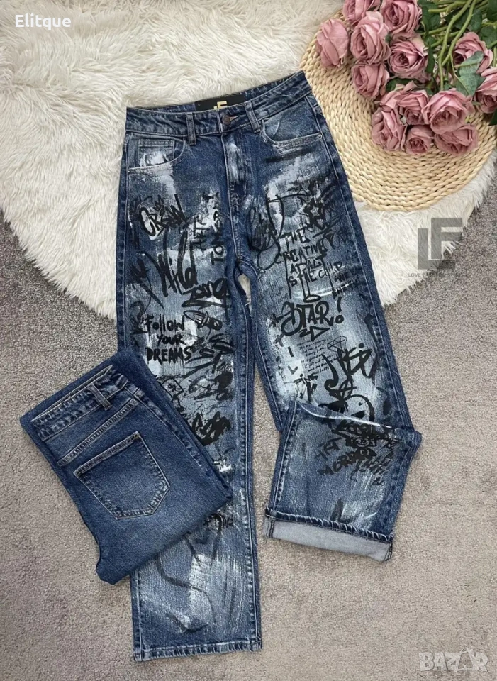 Дънки LFS Graffiti 1019 33.90€ (66.30лв.) Материя: Деним със средна еластичност ( 74% памук, 25% полиестър, 1% еластан ) Кройка: Кройката е с прави, широки крачоли, издължаваща, средна към висока талия, ръчно рисувни #LFS Стилистите съветват: Любима кройка и стилен цвят, от които не можем да свалим очи. Точно тези са със средна към висока талия, прави с издължаващ ефект! Излишно е да казваме, че са в графа #musthave, но ако все пак се чудите дали имате нужда от тях и с какво ще ги съчетаете, казваме Ви – да, имайте ги и ги носете смело с всичко в гардероба си от ризи до дантелени блузи или oversize тениски. Дължина: Цяла дължина 110 см, дължина от вътрешната част на крачола 80 см Размер на снимката – S
