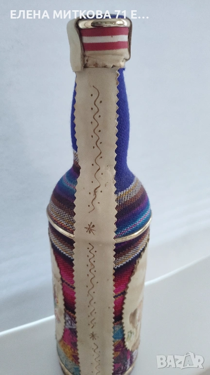 Ръчно декорирана с тъкан плат и кожа и златисти лайсни стъклена бутилка от Перу-в етно стил, снимка 1 - Антикварни и старинни предмети - 53181101 Ръчно декорирана с тъкан плат и кожа и златисти лайсни стъклена бутилка от Перу-в етно стил, снимка 2 - Антикварни и старинни предмети - 53181101 Ръчно декорирана с тъкан плат и кожа и златисти лайсни стъклена бутилка от Перу-в етно стил, снимка 3 - Антикварни и старинни предмети - 53181101 Ръчно декорирана с тъкан плат и кожа и златисти лайсни стъклена бутилка от Перу-в етно стил, снимка 4 - Антикварни и старинни предмети - 53181101 Ръчно декорирана с тъкан плат и кожа и златисти лайсни стъклена бутилка от Перу-в етно стил, снимка 5 - Антикварни и старинни предмети - 53181101 1/5