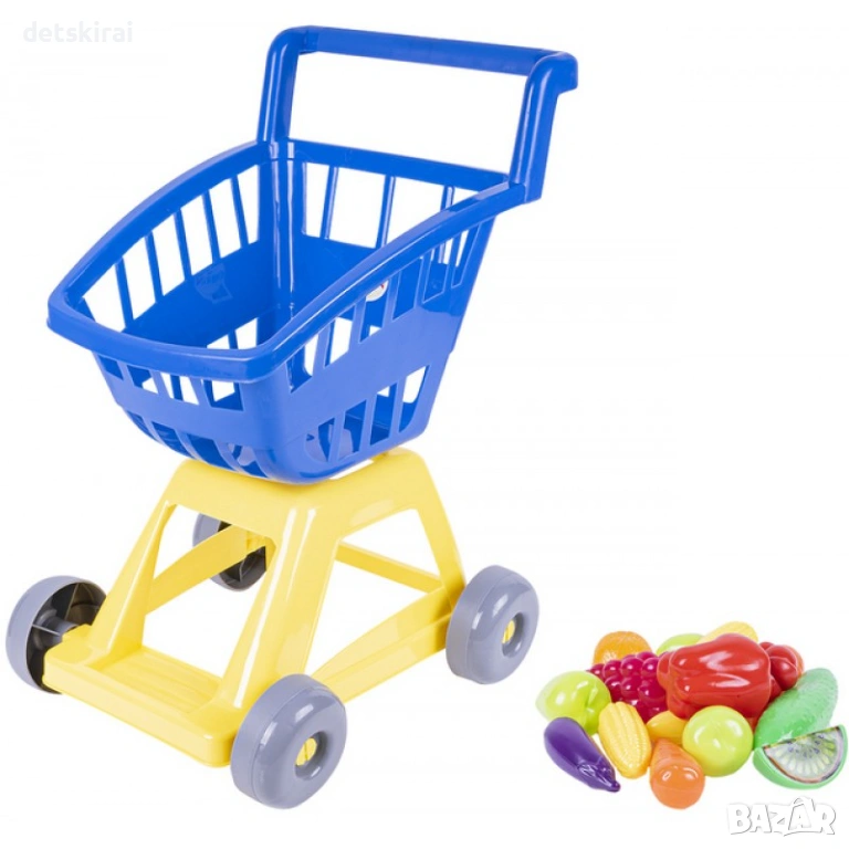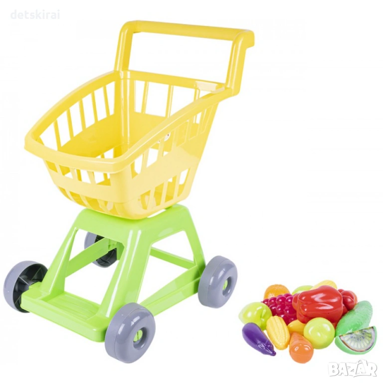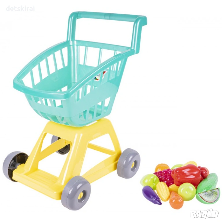 В количката са включени различни плодове и зеленчуци, които правят играта още по-реалистична и интересна. Детето може да сортира продуктите по цвят, форма или вид, да ги поставя и изважда от количката, както и да ги използва в ролеви игри като магазин, пазар или кухня. Това подпомага развитието на логическото мислене, социалните умения и умението за общуване чрез игра.