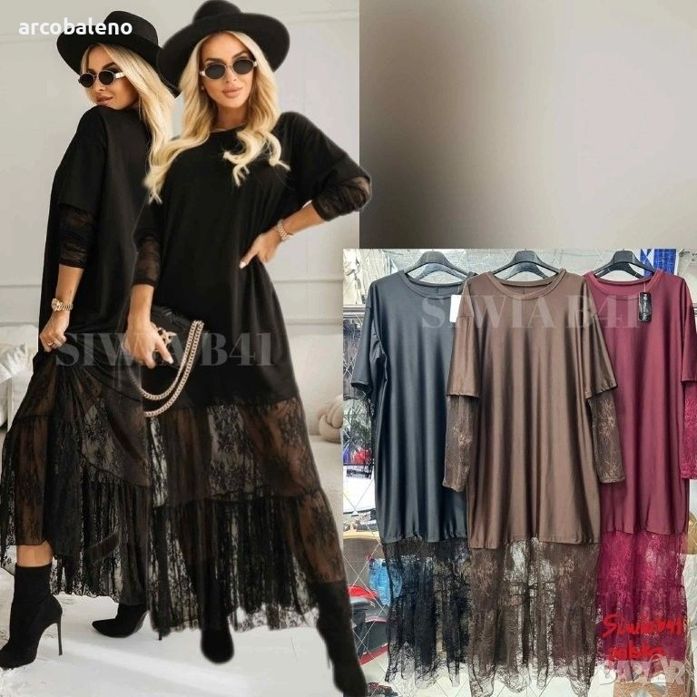 Елегантна и семпла макси рокля, която съчетава ежедневен комфорт с женствено докосване на дантелени детайли. Изработена от еластична материя, свободната ѝ кройка осигурява комфорт и свобода на движение. Семплият ѝ дизайн с кръгло деколте я прави идеална както за ежедневно носене, така и за вечерно излизане. Привличащите вниманието дълги ръкави с дантелени вложки и дантелен подгъв придават на роклята лек и фин характер.