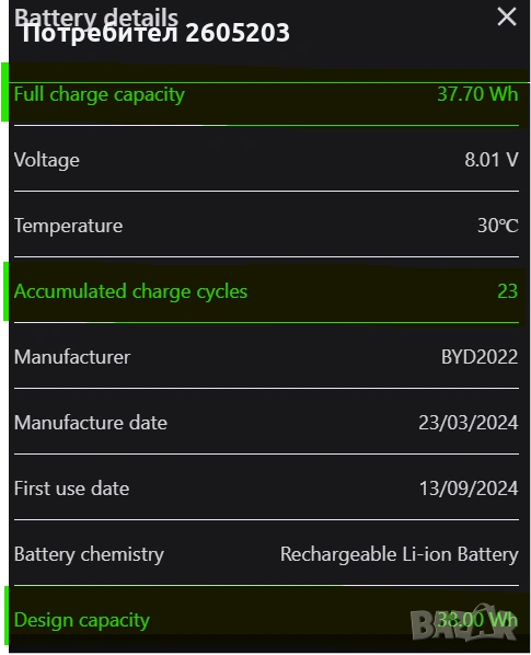 - Батерията е на 99% здраве (както се вижда от снимката). Само на 23 зарядни цикъла (чисто нова).. Лаптопът е активиран за първи път през Септември 2024 г. (ползван е реално 4 месеца). Винаги е ползван с активиран режим за защита на батерията