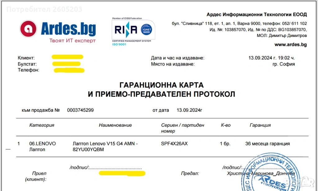 Лаптопът е активиран за първи път през Септември 2024 г. (ползван е реално 4 месеца).