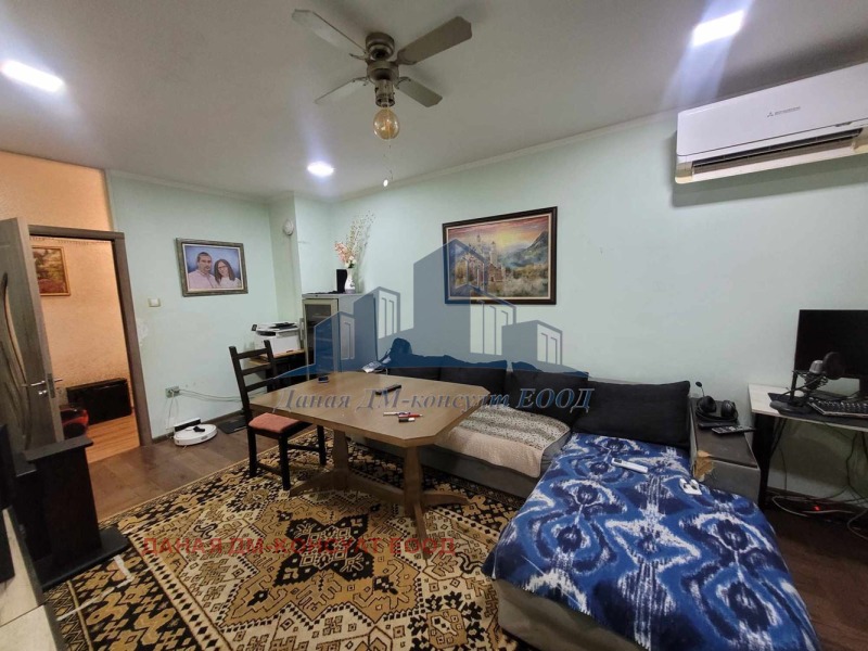 ТРИСТАЕН ТУХЛЕН апартамент с площ от 89 кв.м. разпределени по следния начин: Г-образен коридор, ДВЕ спални, хол, кухня, мокро помещение, баня и тоалетна в отделни помещения. Жилището е отремонтирано, санирано и се предлага със част от обзавеждането. Изложението е ЮГ/ИЗТОК . Просторни и светли стаи.В непосредствена близост до училища, хранителни магазини, детска градина, автогара, ЖП гара. Към имота има изба.