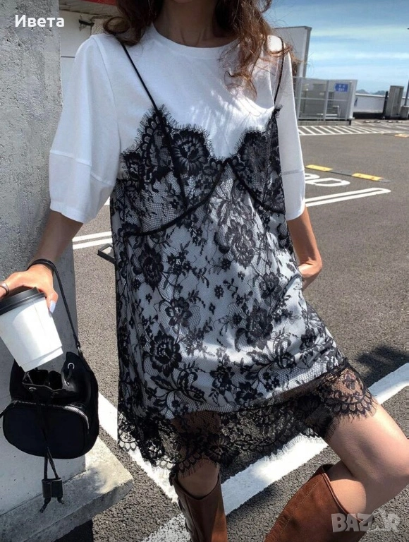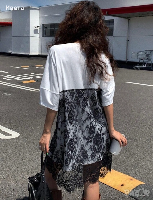 Страхотна дамска рокля с дантела. Имитира бяла рокля тип тениска със страхотна дантела. Много нежна и красива за всеки повод
