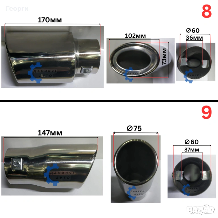 08. Накрайник за ауспух Ф60 х 73 х 102 х 170мм - 17,00 лв. ( 8.69 € )