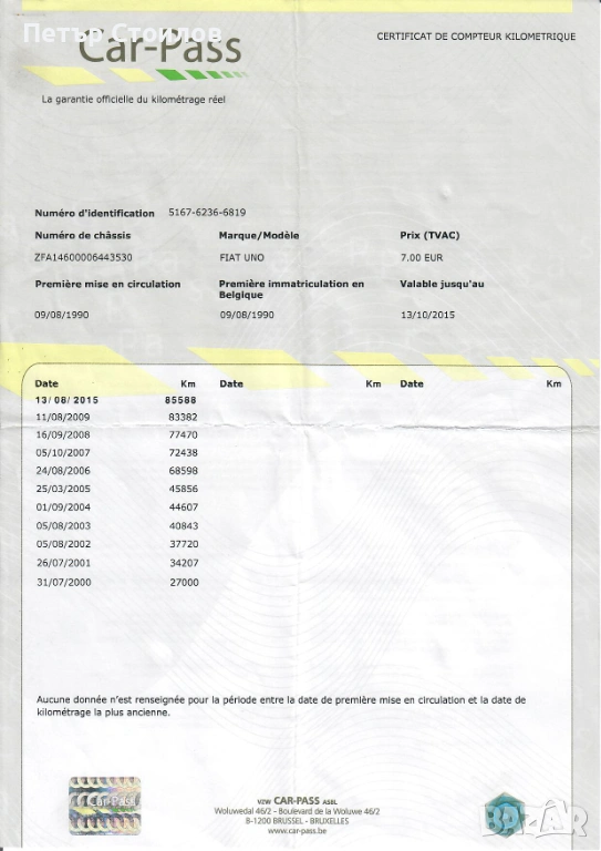 Продавам Fiat Uno, първа регистрация на 09.08.1990 г., с реални и доказуеми 87 700 км. Автомобилът е внесен от Белгия през януари 2025 г. и регистриран в България на 11.02.2025 г.