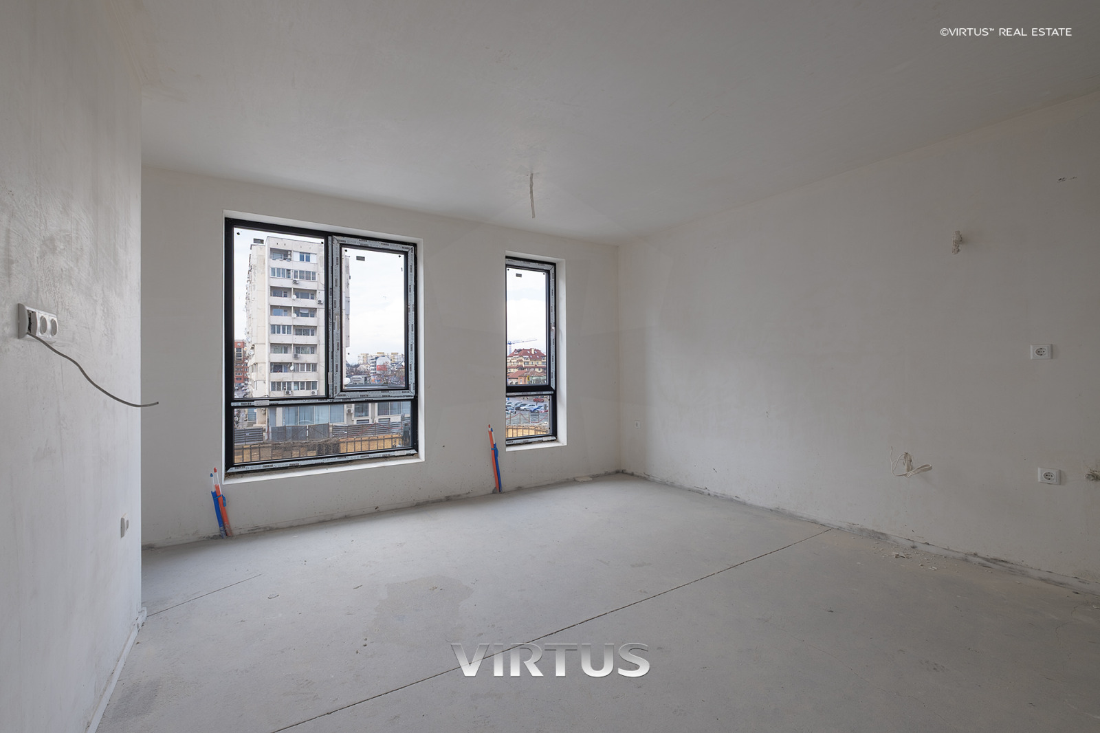 ВИРТУС предлага едностаен апартамент, тип 'студио', със застроена площ от 29 кв.м. Състои се от: дневна с кухненски бокс, кът за спане и баня с тоалетна. Етаж: 4-ти от 6. Изложение: запад. Отопление: ТЕЦ. Състояние: шпакловка и замазка. Към апартамента има складово помещение, разположено в сутерена на сградата. Предлага се и подземно паркомясто, което се заплаща допълнително.