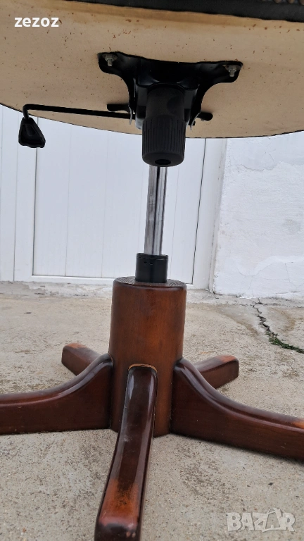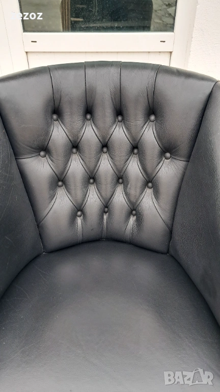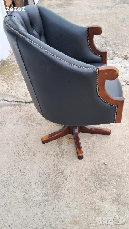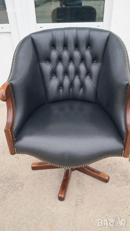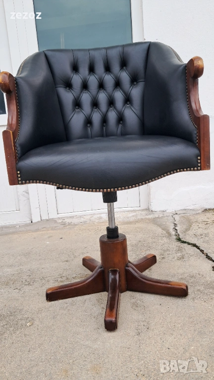 Изработен в стил "Честърфийлд".Характерните за стила елементи-Кожена еко тапицерия с капитониран гръб с копчето подредени като диамант.Дървена конструкция и подлакътници.Стола е с повдигащ механизъм и е на колела.Конструктивно здрав.Кожата е без скъсано и напукано.Леки забележки по дървото на подлакътниците.