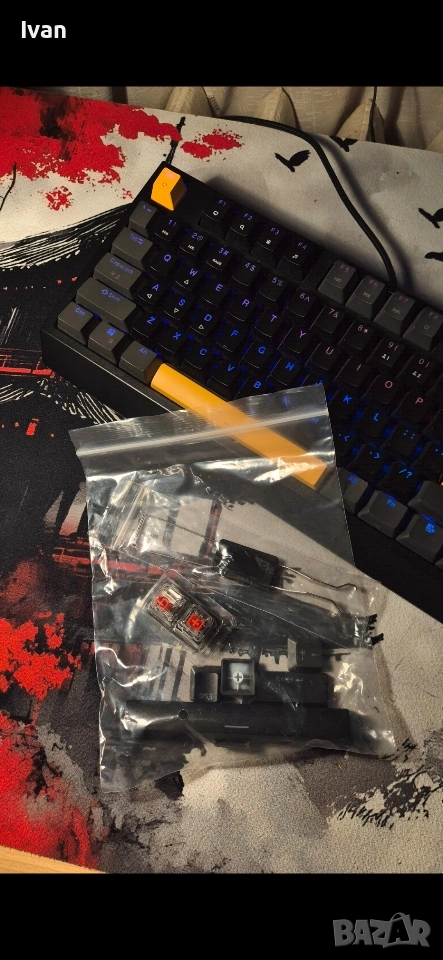 Клавиятурата е чисто нова. Има червени суичове. Идва с 2 резервни суича, резервни кей капове и книжка за управление.