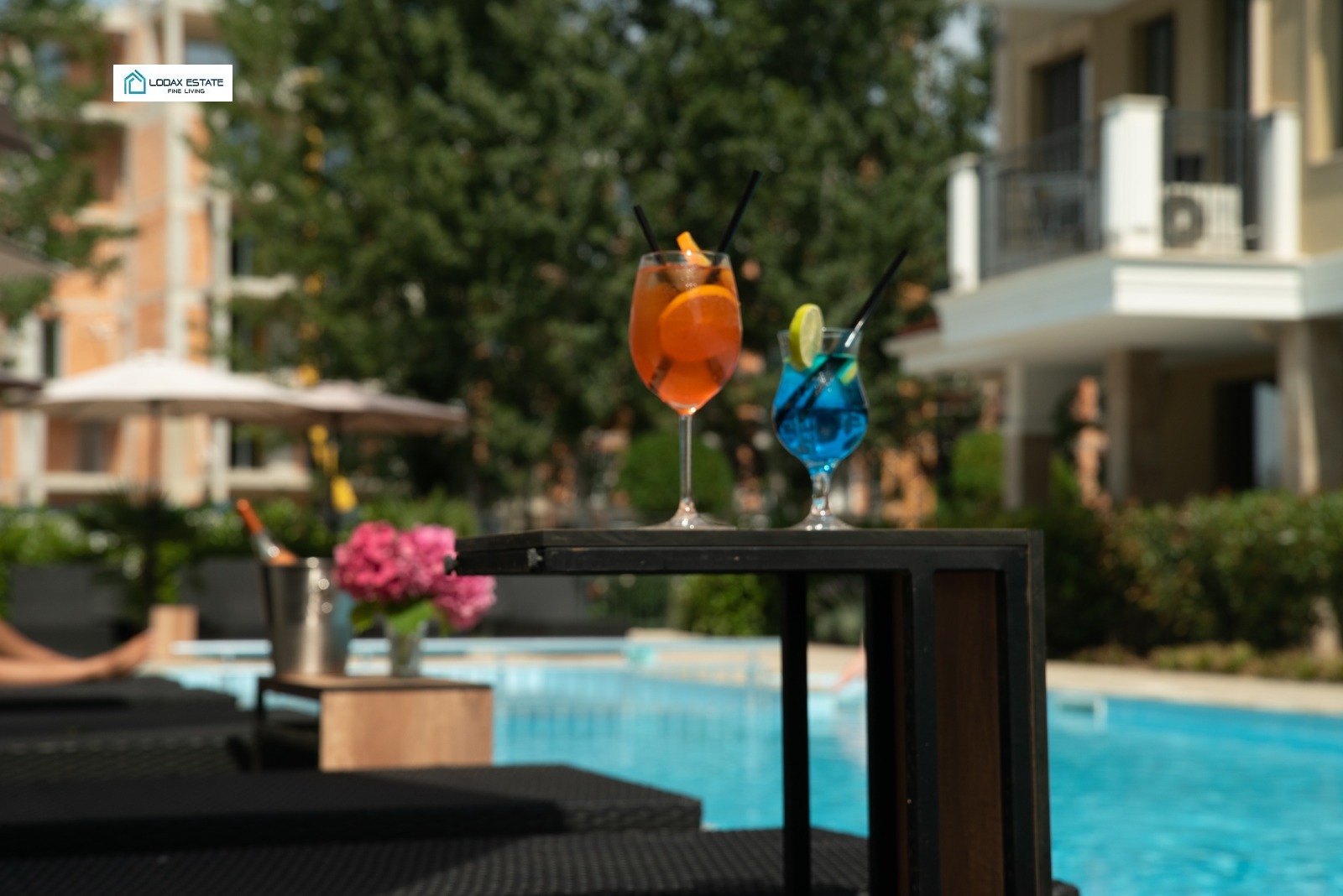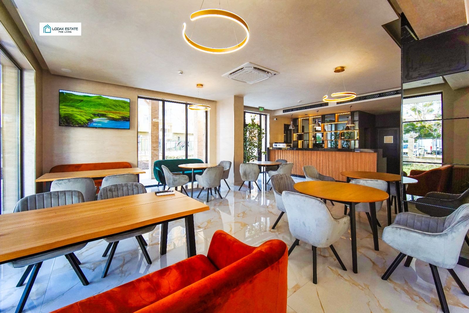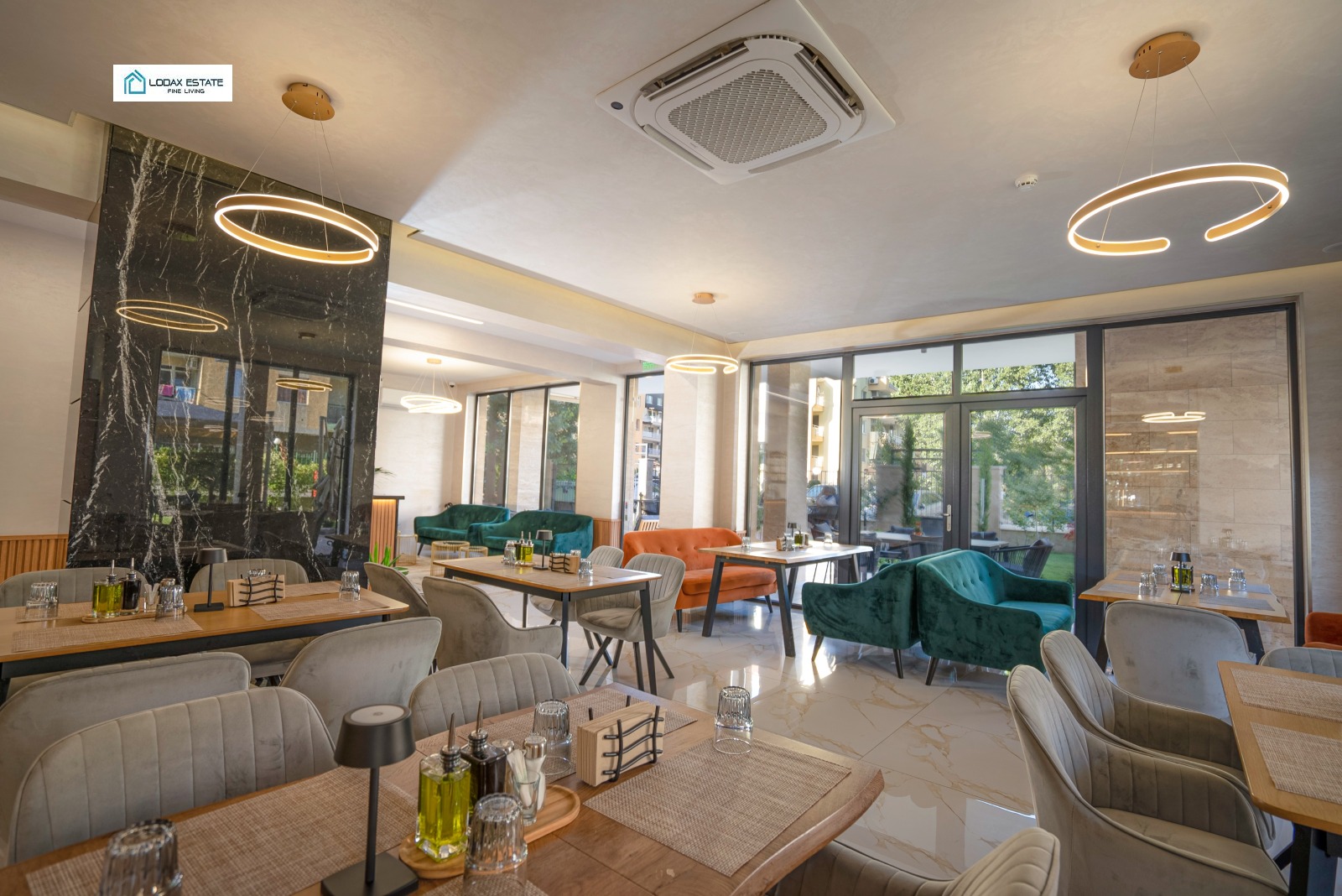 Панорамни прозорци и външни маси, разположени сред богато озеленена среда