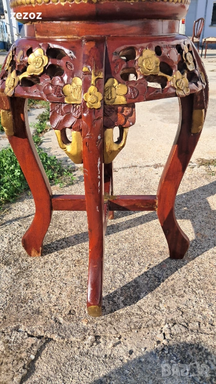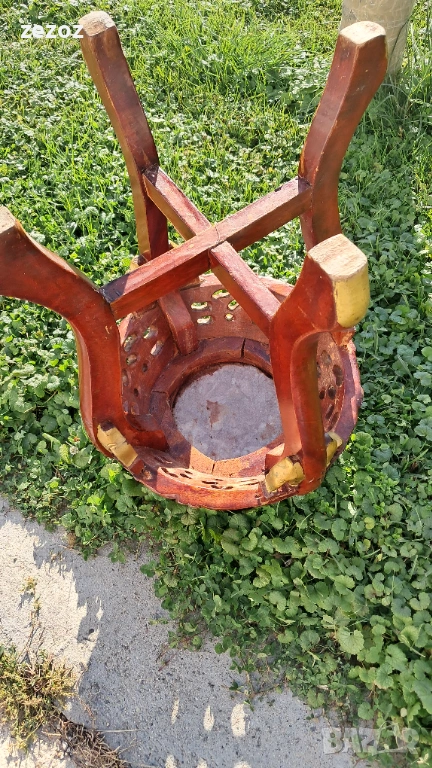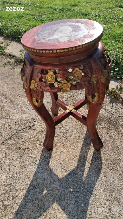 Красива странична масичка или поставка за ваза и др.Изработена от масив махагон в азиатски стил.В плота е вграден розовеещ мрамор.Ръчна дърворезба,като някои елементи са оцветени.Много запазена.Размери-