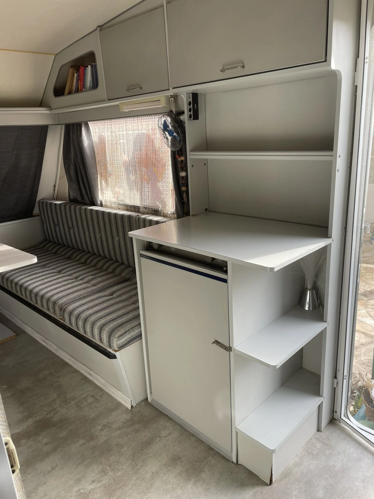 В чудесно състояние, без мирис и течове. Голямо сепаре с удобна и здрава маса. Трансформират се на спалня. Разполага с кухненски бокс с два котлона на газ и работеща и чиста мивка. Водата се зарежда в туби под нея. Хладилник на 12в и 220в. Има нужда от профилактика. Не е ползван от дълго време и не е свързанкъм 220V. Газова печка на TRUMATIC. Не е ползвана от дълго време и има нужда от профилактика. Разполага с газова бутилка включена към печката и котлоните в кухната. Има мокро помещение с пригодена работеща и удобна баня, както и химическа тоалетна. Телевизор на 12V. Всички осветителни тела и контакти работят, както на 12V така и на 220V. В движение с регистрация. Има изтекла гражданска отговорност .