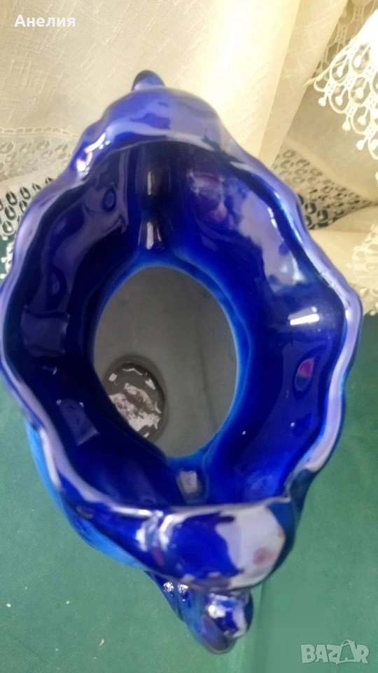 Прекрасна ваза с кобалтов цвят и рисувани рози под глазурата.