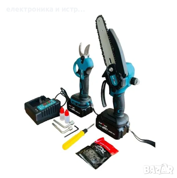 Характеристика на Мини Триона: ВИСОКА ЕФЕКТИВНОСТ – Акумулаторен верижен трион може да отрежете за около 10 секунди дървена греда с диаметър 15 cm. в зависимост от действителния размер и твърдост на дървесината. Този трион е много подходящ за рязане на дърво, подрязване на клони на дървета, градинарство. ИЗПОЛЗВАНЕ С ЕДНА РЪКА – Тази мини моторна резачка е с тегло само 750грама и дължина на шината 16см и 10см. Всеки може лесно да го използва, не е уморително за дълго работно време. ЛЕСЕН МОНТАЖ – Целият верижен трион е инсталиран, трябва само да използвате гаечния ключ, за да завъртите винта и да регулирате веригата, и накрая да затегнете винта. Не е необходимо да инсталирате веригата отделно. СИГУРЕН – Интегрираната направляваща плоча може бързо да разсейва топлината, защита от претоварване и е много устойчива на падане и износване. Страхотно за вашите различни нужди. Комплектът включва: -Акумулаторен верижен трион -Акумулаторна лозарна ножица -2 акумулаторни батерии 36v 8ah -Зарядно устройство веригa за триона -Масло за смазване -Инструменти за сглобяване - -Куфар за съхранение