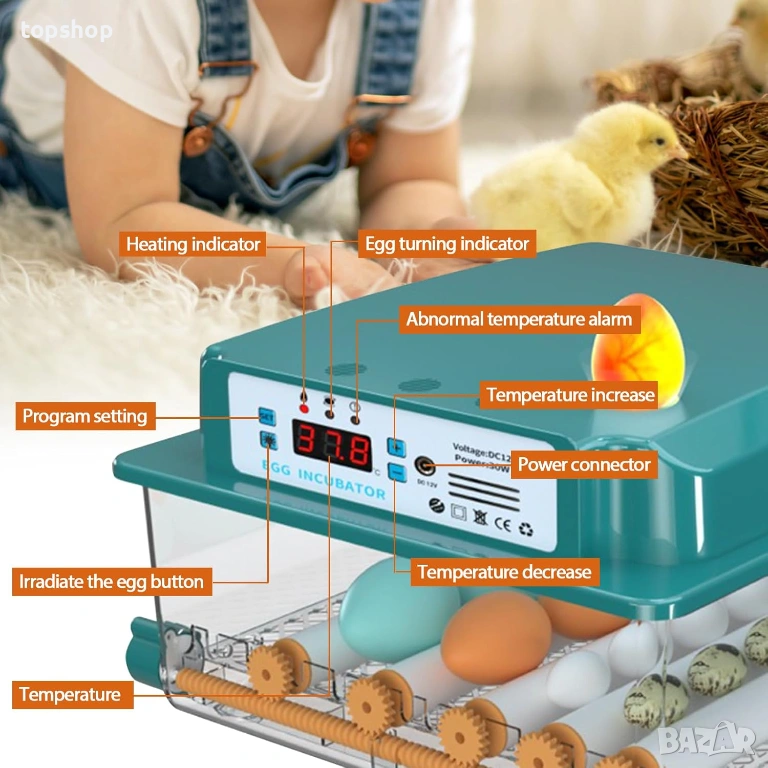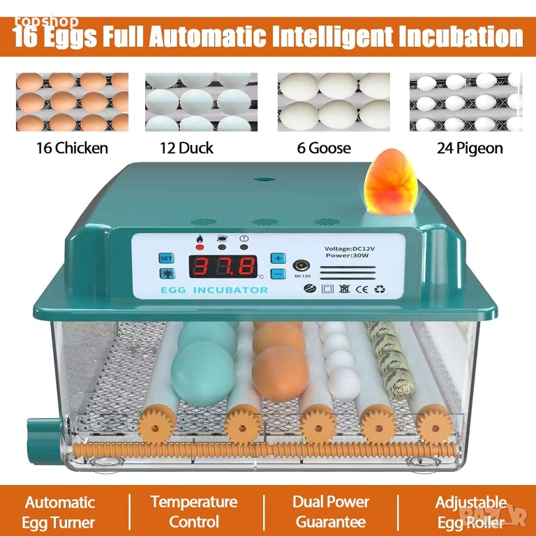 инкубатор за яйца Инкубатор за 16 кокоши яйца Автоматичен контрол на температурата Автоматично обръщане на яйцата Двоен електрически дизайн
