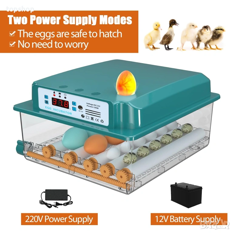 【Дизайн с двойно захранване】Инкубаторът е оборудван с функция за автоматично превключване на двойното захранване, за да не се страхувате от прекъсване на захранването. Инкубаторът може да бъде свързан към 12 V батерия или 220 V захранване. Обикновено инкубаторът използва 220V домакинско електричество и автоматично превключва към батерия в случай на прекъсване на захранването.