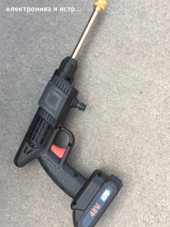 напрежение 36 V, максимален дебит 4 л/мин. и налягане 22 бара. Притежава здрава метална тръба с месингова бърза връзка за дюзите. Може да използва вода от водопроводната мрежа, както и от съдове с вода (бидон, туба, река и др.).Оборудвана е с дюза (червената) за концентрирана струя и с дюза (бялата) за разпръскване на водната струя във ветрилообразна форма под ъгъл от 40°. Доставя се в комплект с зарядно устройство и 2 батерии.