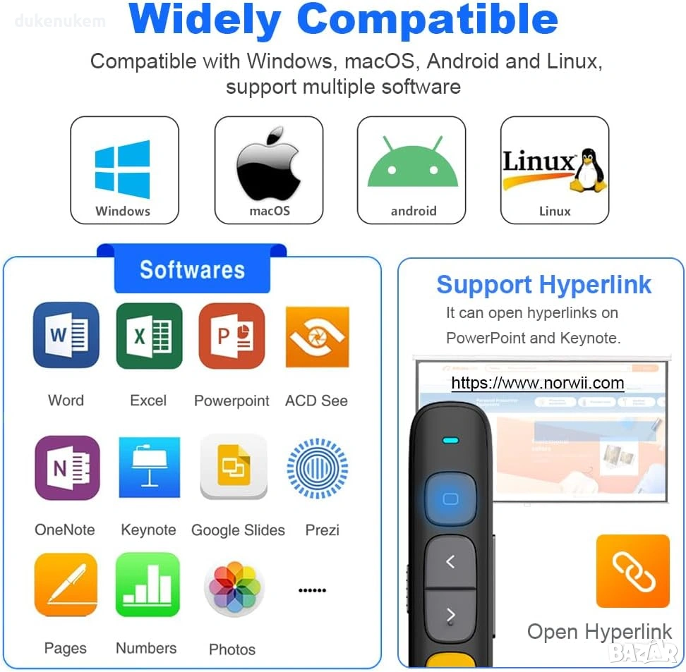 Съвместим с PowerPoint, Prezi, Keynote, Google Slides, Propresenter и MediaShout.