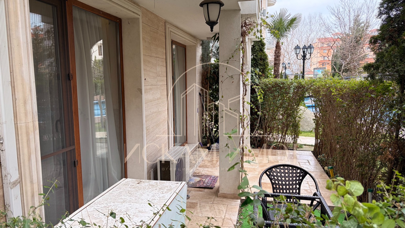 Имотът е напълно обзаведен с нова мебелировка и електроуреди, готов за незабавно ползване. Разпределение: просторна дневна с кухненски бокс, основна спалня, отделена допълнителна спална зона, входно антре, баня с тоалетна, два самостоятелни дворa и директен излаз към басейните на комплекса.