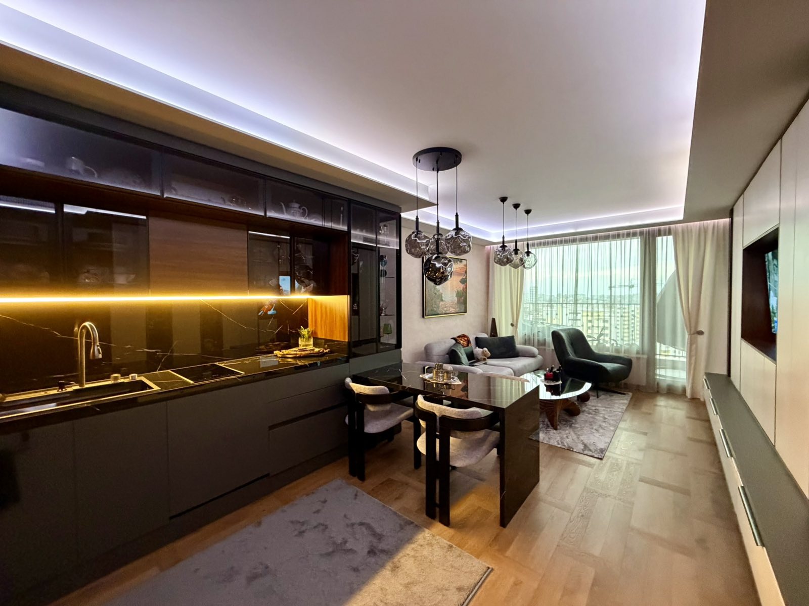 Апартаментът е луксозно завършен с висококачествени материали, обзаведен с мебели по индивидуален проект и оборудван с електроуреди от най-висок клас, всички в гаранция.