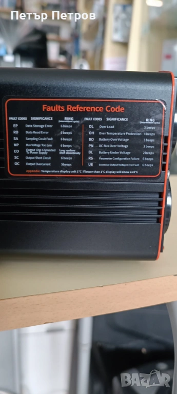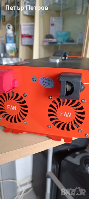 Автомобилен инвертор. Използван е за един летен сезон и се премина към 24 волтова система , отново с инвертор. Моделът, който предлагам е изключително надежден с върхова мощност 9000 вата и постоянна мощност от 3500 вата. Тежи 4,5 килограма. Доста е обемен. Разполага с 4 броя контакти шуко и дисплей с основни характеристики при потреблението. Без проблеми поддържа употребата на домашни електроуреди с посочените ел.изисквания. С пълна синусоида е и може да се използват по-чувствителни уреди като компютър, лаптоп, съвременни телевизори. Домашен климатик или грил фурна до 3000 вата работят без проблем. Няма вариант за намаление на цената. Закупих го за 520 евро.