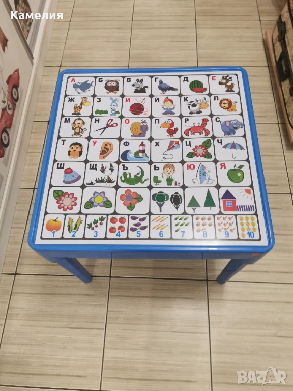 Детска пластмасова маса в син цвят. Без счупени елементи. Забележки само по повърхността на плота. Плота е с картинка на азбуката и числата 1-10. Размери: в 47 см. / ш 51 см / д 51 см.