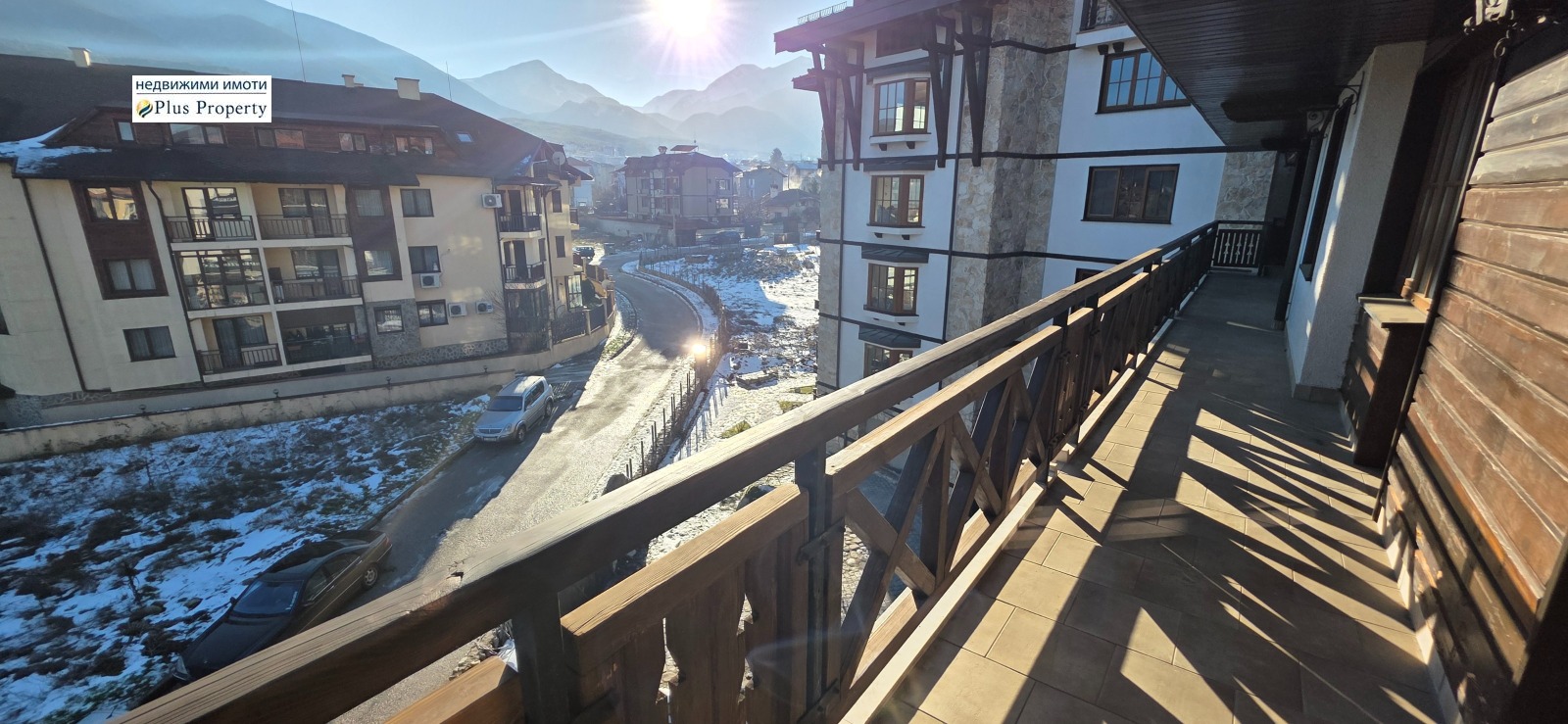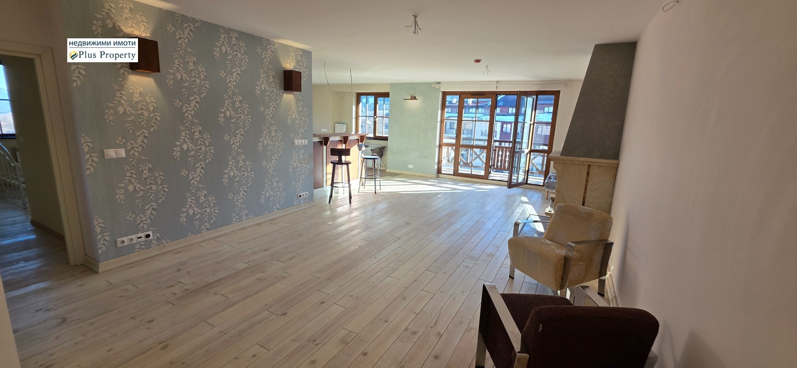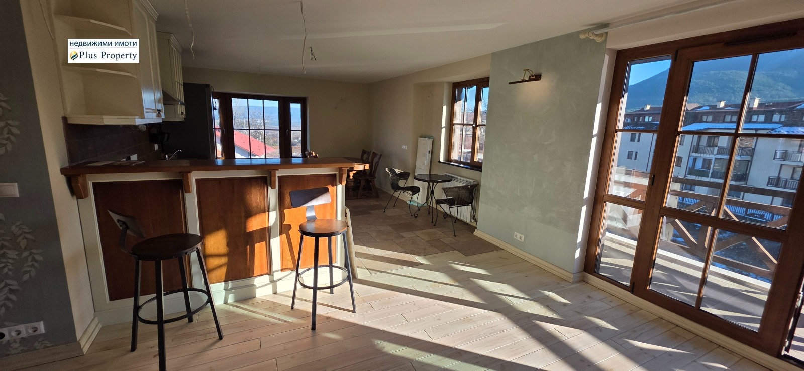 Апартаментът се състои от входно антре, просторна кухня, изработена от масивно дърво, напълно оборудвана с фурна, газов котлон, абсорбатор и хладилник. Светлата и просторна всекидневна/трапезария разполага с камина на дърва и е красиво обзаведена с маса за хранене със столове и кресла. Има достъп до балкон с южно изложение и невероятна панорамна гледка към Пирин. Основната спалня е обзаведена с двойно легло и има самостоятелна баня, оборудвана с вана, мивка и тоалетна. Втората спалня е необзаведена, с два големи прозореца с източно изложение. Втората баня е оборудвана с душ, мивка и тоалетна.