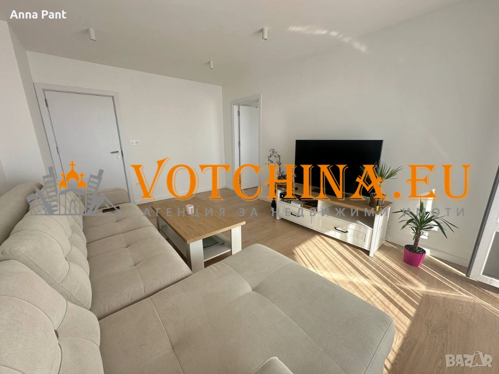Светла всекидневна с големи прозорци и комфортен мек диван