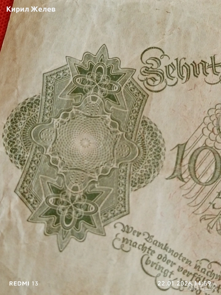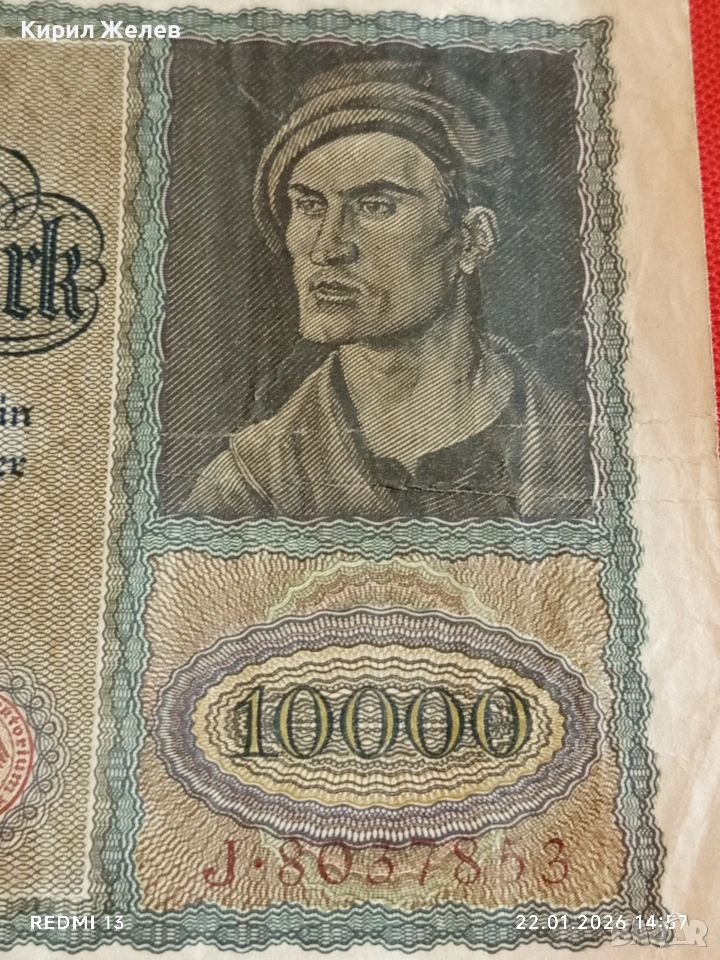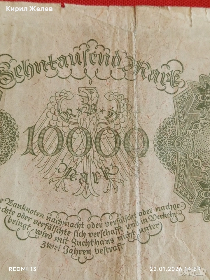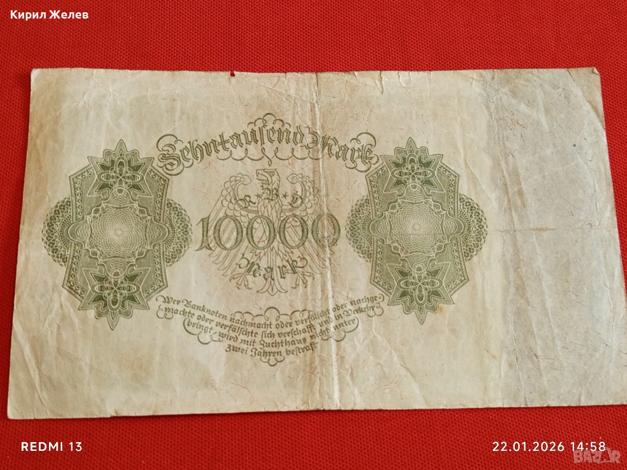 Райх банкнота 10 000 марки 1922г. Германия уникат за КОЛЕКЦИОНЕРИ 53297 → Обява 53189133